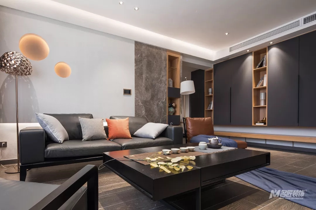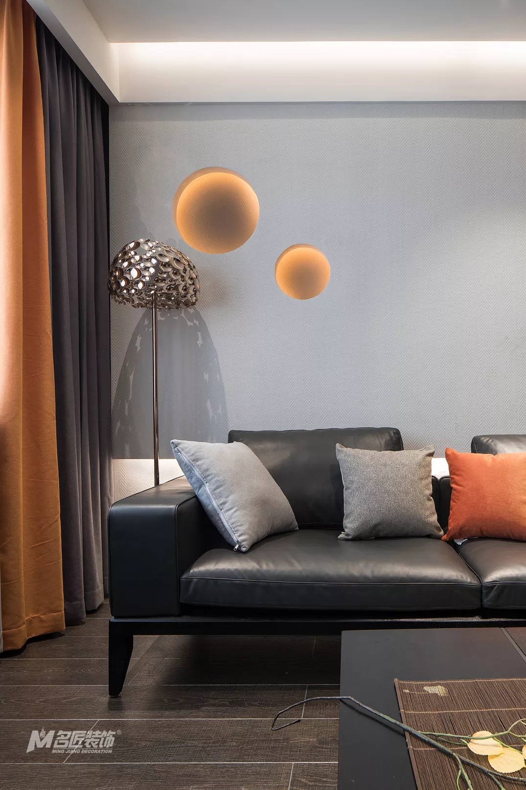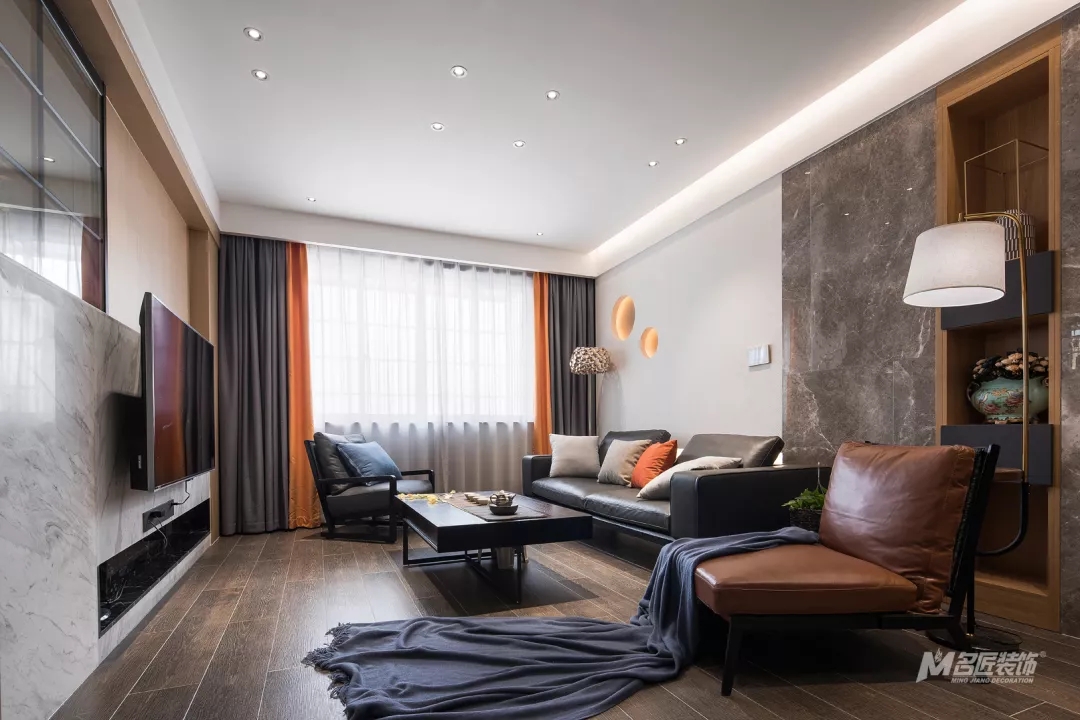 整洁清爽的客厅,由高级灰搭配着原木色、爱马仕橙,时尚气息浓郁,又有着自然的温暖感受。